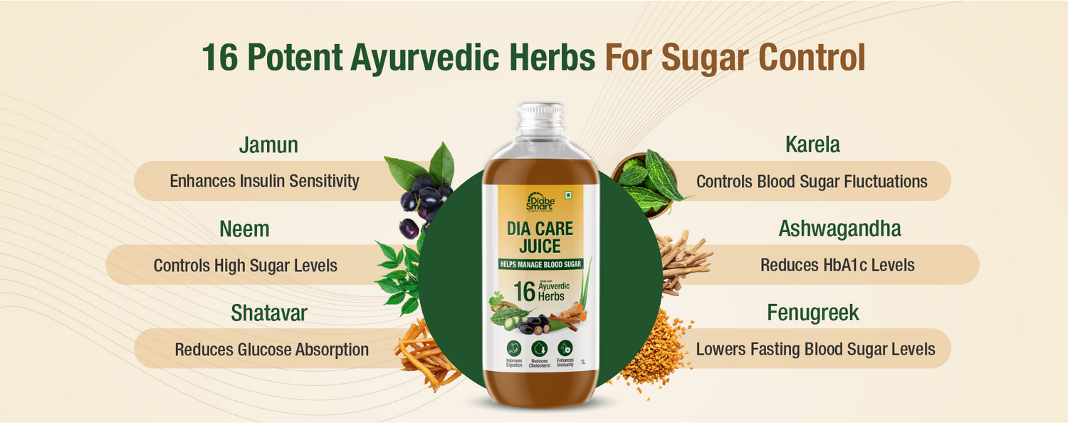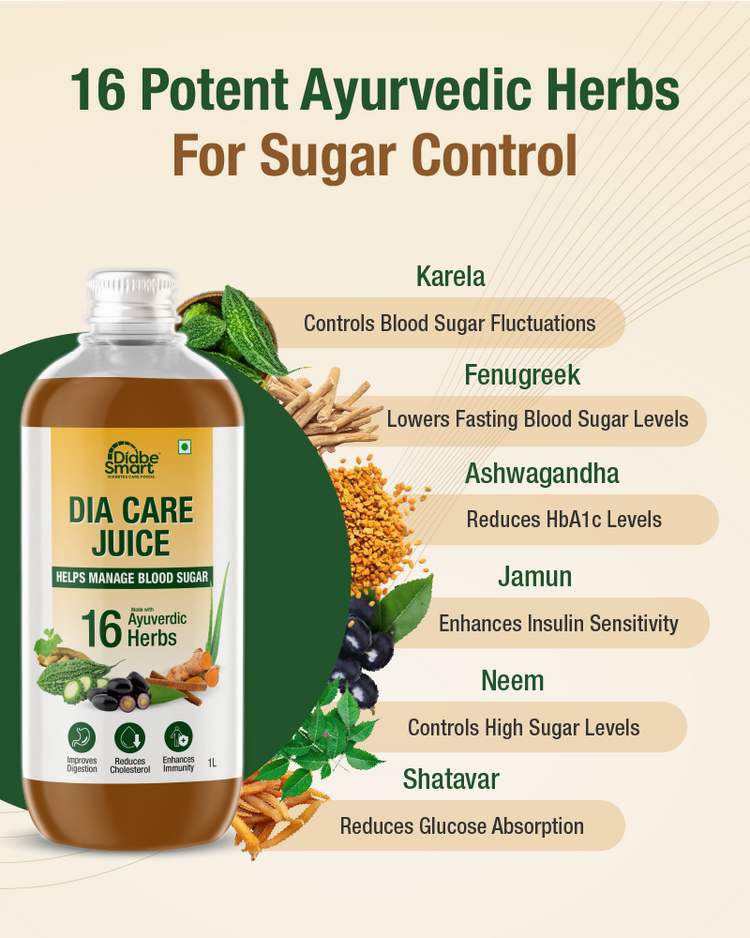 What are the ayurvedic ingredients in the Dia Care diabetic care juice?